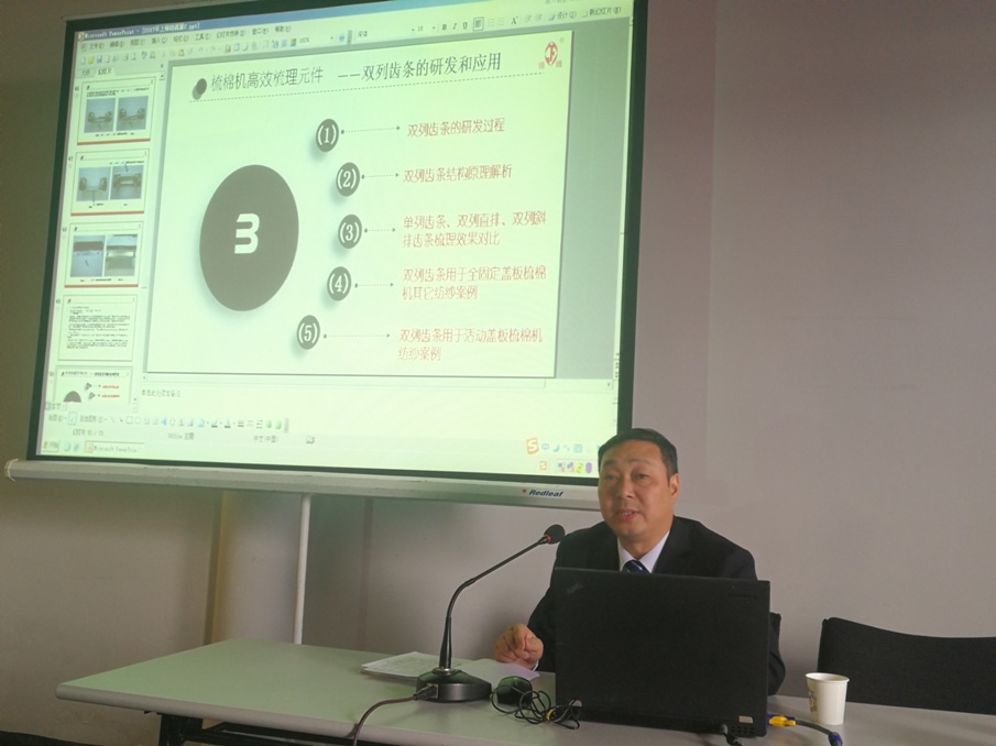 除了實(shí)物產(chǎn)品展示外,今天錦峰還在E2M11為觀展代表帶來了兩場(chǎng)精彩的技術(shù)講座。其中,吳宜貴副總經(jīng)理做了《JZX-5型梳針鋸齒整體錫林的設(shè)計(jì)與應(yīng)用》和《棉精梳機(jī)技術(shù)升級(jí)給棉紡織企業(yè)帶來降本提質(zhì)的效應(yīng)》的技術(shù)報(bào)告,著重介紹了該產(chǎn)品的研發(fā)背景,結(jié)構(gòu)設(shè)計(jì)以及特性和使用情況等。最后,徐國(guó)勝高工做了《高效梳理元件—雙列齒條的研發(fā)和應(yīng)用》的技術(shù)講座,引起與會(huì)專家的高度共鳴。